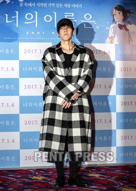 [ 펜타프레스 -2017/01/18] 18일 서울 동대문 메가박스에서 열린 기자간담회에서 영화 <너의 이름은.(감독: 신카이 마코토)>의 음악을 맡은 일본 밴드 <래드윔프스>의 노다 요지로가 포토타임을 갖고 있다.