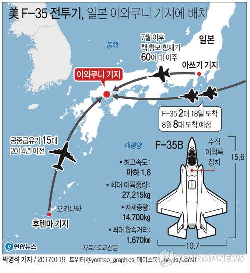19일 도쿄신문에 따르면 미국 해병대 소속의 최신예 스텔스 전투기인 F-35 2대가 지난 18일 저녁 이와쿠니 기지에 도착했다.