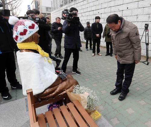 (부산=연합뉴스) 김선호 기자 = 박삼석 부산 동구청장은 19일 일본 정부가 연일 철거를 요구하는 일본영사관 앞 소녀상을 방문, 고개를 숙이고 "폐쇄회로(CC)TV를 설치해 관리하겠다"고 밝혔다.
