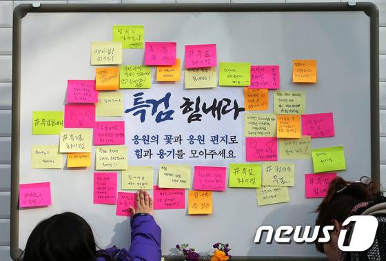 (서울=뉴스1) 임세영 기자 = 19일 오후 서울 강남구 대치동 '박근혜 정부의 최순실 등 민간인 국정농단 사건 수사 특별검사팀' 사무실 앞에 설치된 특검 응원 게시판에 시민들이 응원문구를 붙이고 있다. 2017.1.19/뉴스1