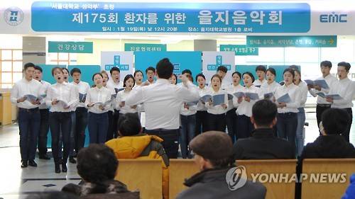 (대전=연합뉴스) 19일 대전 서구 을지대학교병원 1층 로비에서 열린 '제175회 환자를 위한 을지 음악회'에서 서울대 성악부 찬양선교단원이 공연하고 있다. 을지대병원은 2004년부터 매월 정기적으로 음악회를 하고 있다. 2017.1.19 [을지대학교병원 제공=연합뉴스]