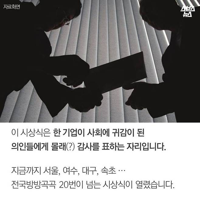 여기 아주 수상한 시상식이 있습니다. 2년 동안 31명에게 시상식을 열어 상을 전했지만 시상식 사진 한 장 찾기 힘듭니다. 시간과 장소 모든 게 수상자가 원하는 대로 진행되는 이 시상식. 이 시상식은 한 기업이 사회에 귀감이 된 의인들에게 몰래(?) 감사를 표하는 자리입니다. 이 기업이 의인들을 찾아 몰래 상을 주는 이유는 무엇일까요? 스브스뉴스가 이 수상한 시상식을 소개합니다.