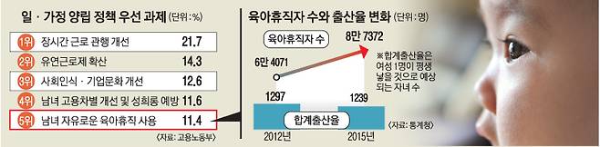 이런 방식은 국민들의 인식과도 괴리가 있다. 지난해 고용노동부가 실시한 일·가정 양립 실태조사에서 국민들이 바라는 최우선 과제는 장시간 근로 관행 개선(21.7%), 유연근로제 확산(14.3%), 사회인식 및 기업문화 개선 캠페인(12.6%) 등이 차례로 1~3위를 차지했다. 자유로운 육아휴직 사용(11.4%)은 5위였다.