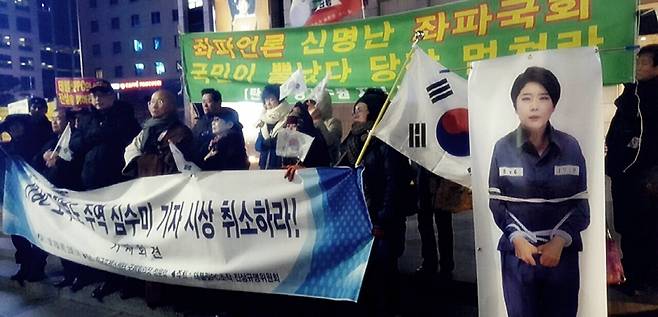 | ▲ 태블릿PC진상규명위원회 회원들이 19일 서울 프레스센터 앞에서 기자회견을 열고 심수미 JTBC기자의 '올해의 여기자상' 시상을 취소하라는 기자회견을 열고 있는 모습. 사진=김준호 대학생 명예기자 |