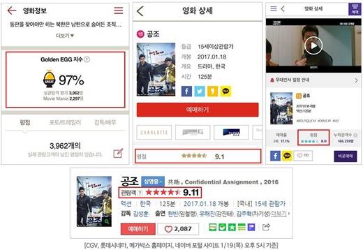 ‘공조’는 1월 19일(목) 오후 5시 기준, CGV 골든에그 지수 97%, 롯데시네마 관람평점 9.1점, 메가박스 관람평점 8점을 기록하고 있다.