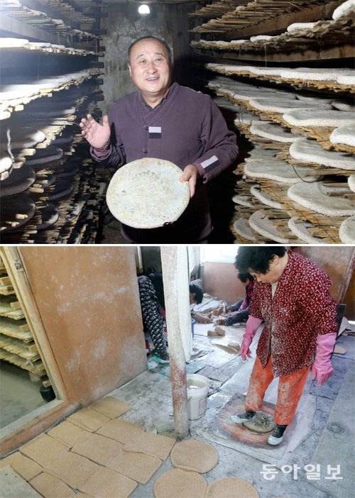 | 500년 넘게 전통을 이어온 한국 토종 누룩 막걸리를 고수하고 있는 유청길 금정산성막걸리 사장(위쪽 사진). 토종 누룩은 통밀에 물을 섞은 반죽을 조심스럽게 계속 발로 밟아 줘야 곰팡이가 골고루 피는 양질의 누룩을 만들 수 있다. 동아일보DB |