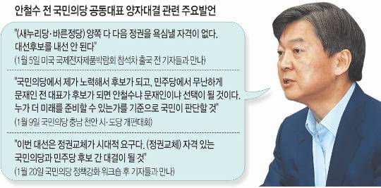 안 전 대표의 이런 자신감에는 반 전 총장이 결국 대선 레이스를 완주하지 못할 것이라는 판단이 깔려 있다. 귀국 이후 잦은 실수로 ‘컨벤션 효과’를 제대로 보지 못한데다 앞으로 본격화될 정치권과 언론의 혹독한 검증의 산을 넘지 못할 것이라는 의미다.