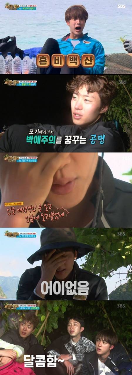 육지에서의 하루. 병만족의 밤은 그야말로 모기와의 전쟁이었다. 공명은 "모기도 먹고살아야 하지 않냐"며 대인배의 모습을 보였다. 하지만 아침에 일어난 공명은 모기의 습격에 당한 얼굴로 웃음을 자아냈다. 밤새 모기에 시달렸던 진은 아침에 일어나자마자 얼굴을 확인했다. 상태를 확인한 진은 황당함을 감추지 못 했다. 진의 입술만을 물어뜯어놓은 것. 진은 "어떻게 입술을 물어"라며 황당해 하다가도 "입술이 매력적인 줄 어떻게 알고 입술을 물었냐"며 자기애를 드러냈다.