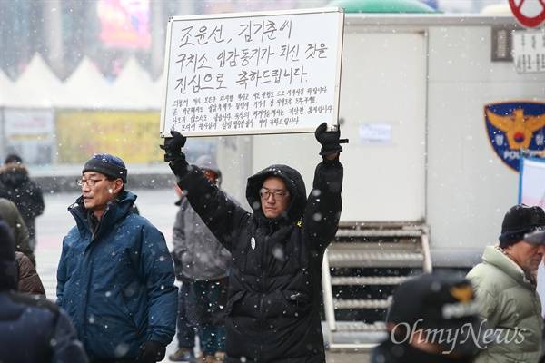 수원에 살고 있는 박점보(71)씨가 21일 서울 광화문광장에서 열리는 13번째 촛불집회에 참여하려고 준비해온 현수막에는 이렇게 쓰여 있었다. 현수막을 활짝 펼쳐 들고 일찍부터 광장 이곳저곳을 돌아다니고 있는 박씨의 머리와 어깨 위로 연신 함박눈이 쌓였다.