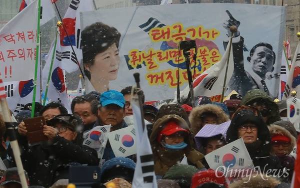 | ▲ 박근혜 탄핵 반대 맞불집회 21일 오후 서울 중구 덕수궁 대한문 앞에서 열린 '제10차 박근혜 대통령 탄핵기각을 위한 국민 총궐기 대회'에서 보수단체 회원과 시민들이 대통령 탄핵 반대와 헌법재판소의 탄핵심판 결정 기각을 촉구하고 있다. |