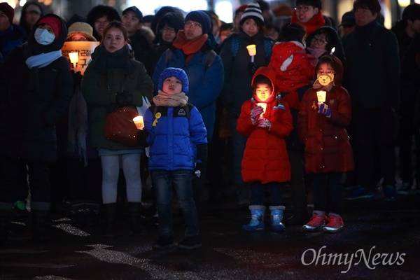 "항상 참여하고 싶었는데, 애와 부모님과 살다보니 못 나왔다. 친정엄마도 나와서 촛불집회에 힘을 싣고 싶었는데, 그렇게 못했다. 그런데 오늘 엄마가 '춥고, 눈이 많이 와서 사람 안 오니까, 우리가 가서 자리 채웠으면 좋겠다'고 해서 힘들지만 나왔다. 항상 아이가 뉴스를 보고 저한테 물어보면 설명해줬는데, 현장에 나오니까 너무 좋다. 아이에게 민주주의가 이런 거라는 게 직접 와 닿을 것 같다.