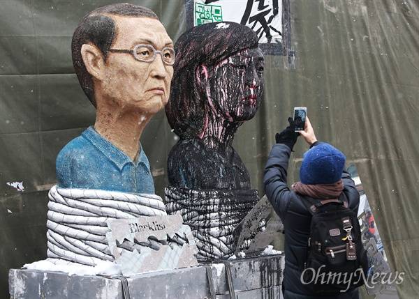 | ▲ 촛불광장에 세워진 '블랙리스트' 김기춘, 조윤선 모형 ‘박근혜 즉각퇴진과 조기탄핵을 촉구하는 13차 범국민행동의 날’인 21일 오후 서울 광화문광장에 ‘문화계 블랙리스트’에 항의하며 문화예술인들이 만든 김기춘 전 대통령비서실장과 조윤선 장관의 모형이 세워져 있다. 김 전 비서실장과 조 장관은 이날 오전 구속되어 서울구치소에 수감된 상태이다. |