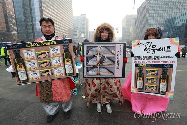 | ▲ '설은 민주주의 회복햄세트와 함께' ‘박근혜 즉각퇴진과 조기탄핵을 촉구하는 13차 범국민행동의 날’인 21일 오후 서울 광화문광장에서 한복을 입은 시민들이 ‘민주주의 회복햄세트’ '이석기 석방햄' ‘김기춘 구속햄’ ‘조기퇴진세트’ 등을 들고 있다. |