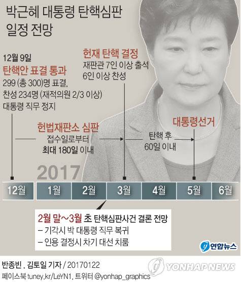 (서울=연합뉴스) 방현덕 기자 = 박근혜 대통령 탄핵심판 사건의 결론이 2월 말에서 3월 초 사이 나올 수 있다는 분석이 힘을 얻고 있다.