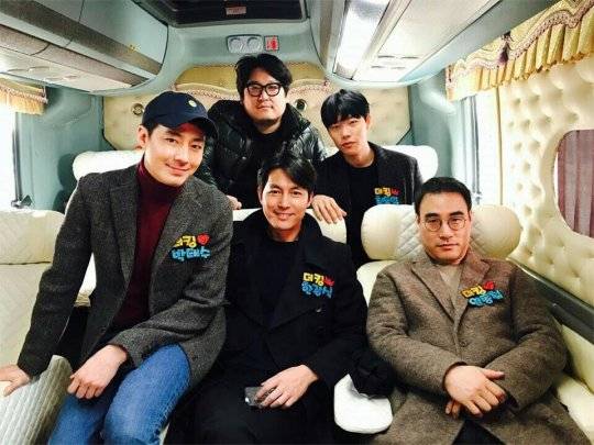 사진에는 전날 대구 일정을 마치고 부산으로 향한 ‘더 킹’ 군단 조인성 정우성 배성우 류준열 그리고 한재림 감독의 모습이 담겨 있다. 일상을 화보로 만드는 훈훈한 비주얼이 인상적. 또 다른 사진 배성우와 조인성 류준열은 카메라를 향해 재기발랄한 매력을 뽐내 눈길을 끈다.