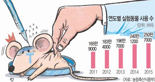 인간을 위한 실험에 희생되는 동물은 2015년 250만 마리를 넘었다. 2011년과 비교해 1.6배 늘어난 수치다. 매해 수백만 마리의 실험동물이 희생되고 있지만 실험동물 보호를 위한 정부 정책이나 입법 등은 부족하다.