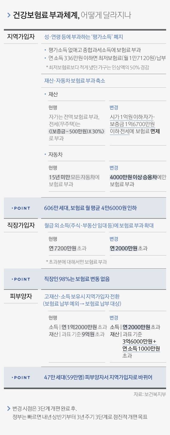 정부안의 핵심은 소득 있는 직장인과 피부양자에게 건보료를 더 걷고, 저소득 지역가입자는 줄이는 것이다. 피부양자 2049만명 중 소득과 재산이 높은 사람을 3단계에 걸쳐 제외한다.
