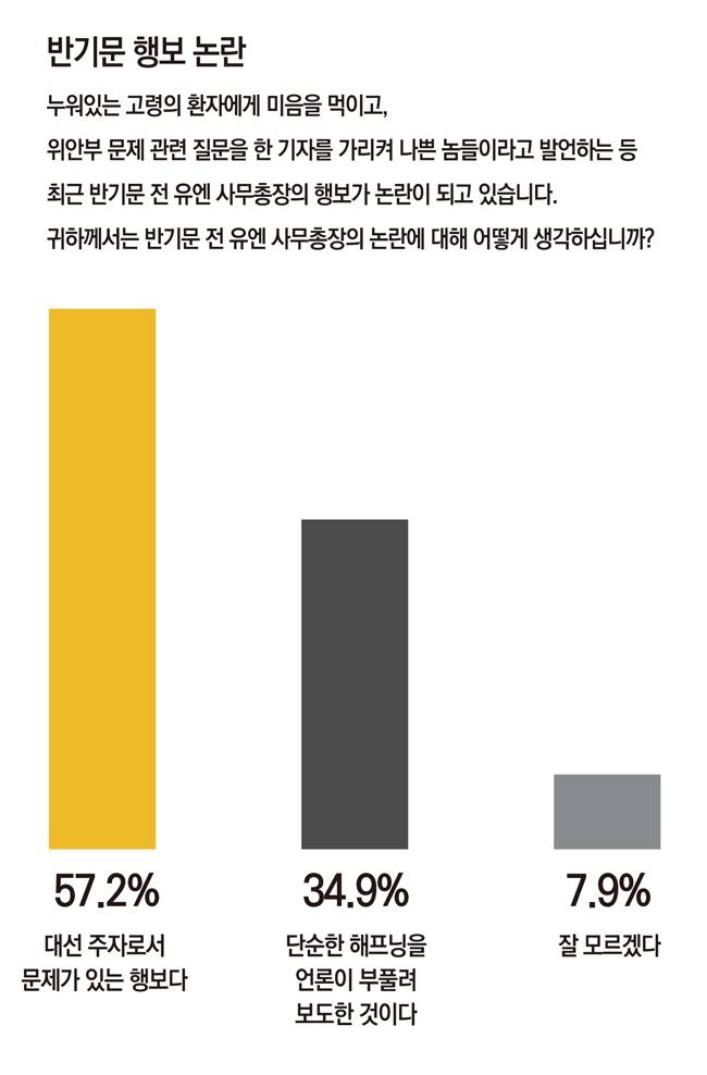 "누워있는 고령의 환자에게 미음을 먹이고, 위안부 문제 관련 질문을 한 기자를 가리켜 나쁜 놈들이라고 발언하는 등 최근 반기문 전 사무총장의 행보가 논란이 되고 있다. 반 전 총장을 둘러싼 논란에 대해 어떻게 생각하느냐"의 질문에 "단순한 해프닝을 언론이 부풀려 보도한 것"이라는 의견은 34.9%에 그쳤고, "대선주자로서 문제가 있는 행보"라고 답한 응답은 57.2%에 달했다.