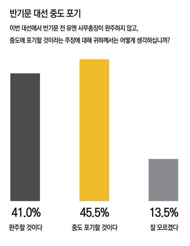 반 전 총장이 중도에 포기할 것이라는 주장에 대한 생각을 묻는 질문에도 "중도 포기할 것"이라는 응답(45.5%)이 "완주할 것"(41.0%)이라는 응답을 앞선 것으로 나왔다.