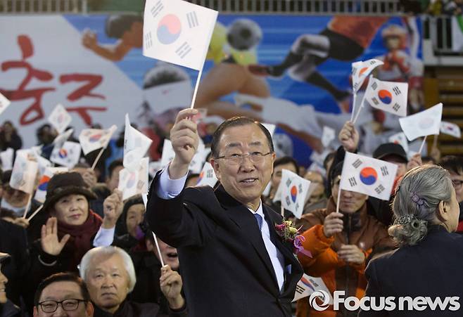 | ▲ 반기문 전 유엔 사무총장이 1월14일 오후 충북 충주체육관에서 열린 충주시민 귀국 환영대회에 참석해 태극기를 흔들며 인사하고 있다. 사진=포커스뉴스 |