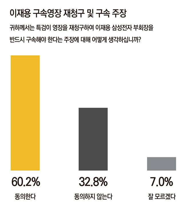 특검이 영장을 재청구하고 이 전 부회장을 반드시 구속해야 한다는 주장에 동의하는 응답도 높게 나왔다. 동의한다는 응답은 60.2%로 나왔고 동의하지 않는다라는 응답은 32.8%로 나왔다. 대구 경북(102) 지역에서도 구속해야 한다는 응답(46.4%)이 구속에 동의하지 않는다는 응답(43.3%)보다 높은 것으로 나왔다.