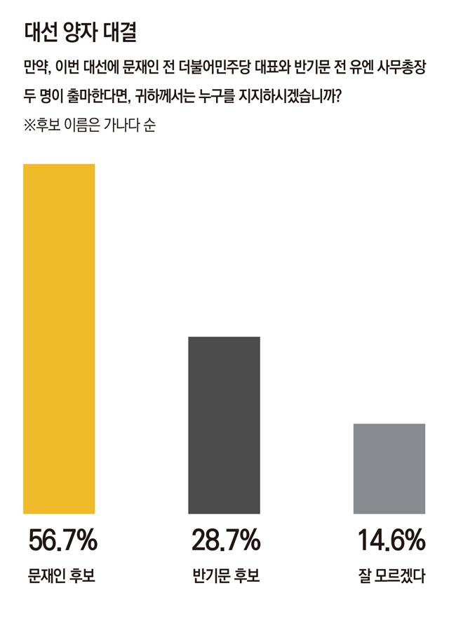 미디어오늘이 (주)에스티아이(대표 이준호)에 의뢰해 지난 20일과 21일 이틀에 걸쳐 전국 만 19세 이상 성인 1,000명을 대상으로 "이번 대선에 문재인 더불어민주당 전 대표와 반기문 전 유엔 사무총장 두명이 출마한다면 누구를 지지하겠느냐"라고 물은 결과 문재인 후보 56.7%, 반기문 후보 28.7%로 나왔다. 지지후보가 없다는 응답은 14.6%였다.
