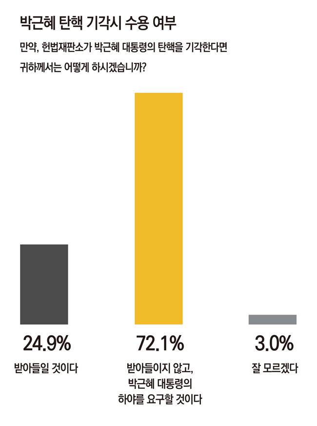 헌법재판소 8차 변론까지 마친 탄핵심판이 빠르면 2월 중순에 나올 것이라는 전망이 높은 가운데 박 대통령 탄핵심판이 기각될 경우 어떻게 하겠느냐라는 질문에 "받아들이지 않고 박 대통령의 하야를 요구할 것"이라는 응답은 무려 72.1%로 나왔다. 탄핵심판 기각 결정을 받아들일 것이라는 응답은 24.9에 그쳤다.