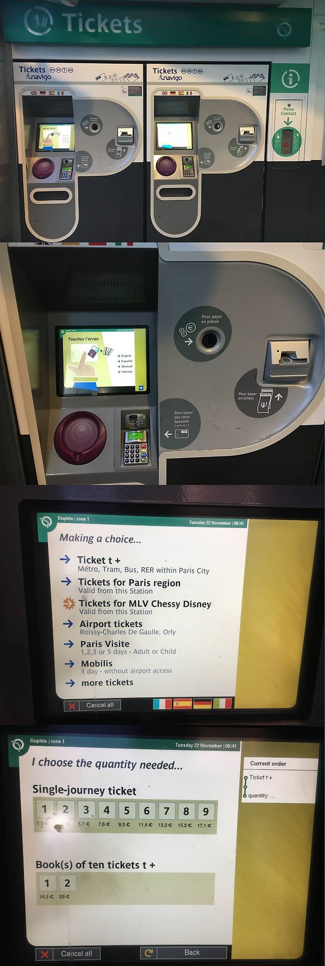 아, 티켓을 구입하는 방법부터 알아보자. 전혀 어렵지 않다. 'Tikets'라고 쓰여 있는 기계를 찾아 순서대로 화면을 터치하면 된다. 'Tiket t+'을 선택하면 1장씩 낱개로 구입할 건지, 10개 혹은 20개씩 묶음으로 구매할 것인지 고르게 된다. 1장이 1.9 유로이고, 10장이 14.5 유로이므로 묶음으로 사는 게 훨씬 유리하다. 만약 하루에 4번 이상 지하철을 탈 예정이라면 Mobilis(1일 권)을 구입하는 게 이득이다.