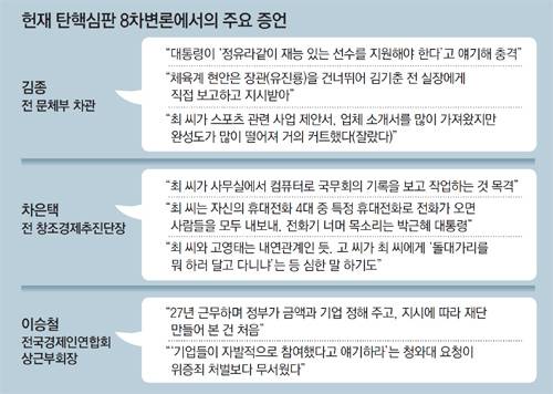 차 전 단장에 앞서 증인으로 나선 김 전 차관은 “2015년 1월 청와대 별관에서 만난 박 대통령이 ‘(최 씨의 딸) 정유라같이 재능 있는 선수는 정책적으로 키워야 한다’고 말해 충격을 받았다”고 말했다. 김 전 차관은 최 씨를 알게 된 경위에 대해 “하정희 순천향대 교수가 ‘문체부 차관 자리에 관심이 있느냐’고 물어 그렇다고 했더니, 하 교수가 최 씨를 ‘정윤회 씨 부인’이라며 소개해 줬다”고 말했다. 하 교수는 최 씨의 딸 정 씨가 다닌 초등학교 어머니모임 회장을 하며 최 씨와 친분을 쌓은 것으로 전해졌다.