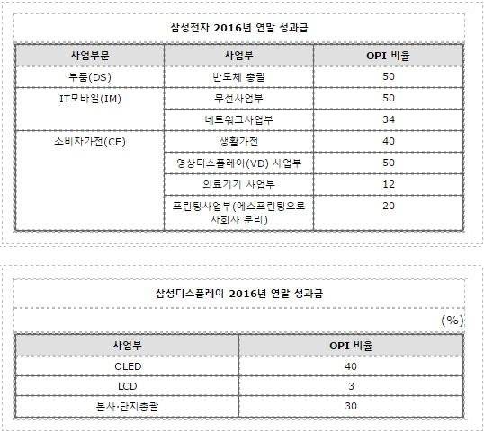 한편 삼성디스플레이에서는 유기발광다이오드(OLED)와 액정표시장치(LCD) 사업부의 희비가 엇갈렸다. OLED는 40%의 성과급을 챙긴 반면, LCD는 3%에 그쳤다. 삼성디스플레이 본사 및 단지총괄은 30%의 성과급을 받았다.
