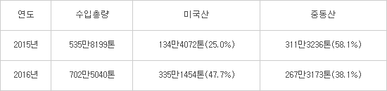 반면에 사우디아라비아, 아랍에미리트(UAE), 쿠웨이트, 카타르 등에서 들어온 중동산 수입은 전년 대비 14.1% 줄어든 267만3173톤에 그쳤다. 비중은 2015년 58.1%에서 지난해 38.1%로 급락했다.