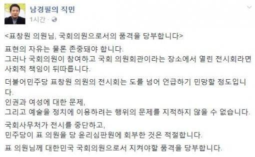 그러면서 “표창원 의원의 전시회는 도를 넘어 언급하기 민망할 정도”라며 “인권과 여성에 대한 문제, 예술을 정치에 이용하려는 행위의 문제를 지적하지 않을 수 없다”고 꼬집었다.