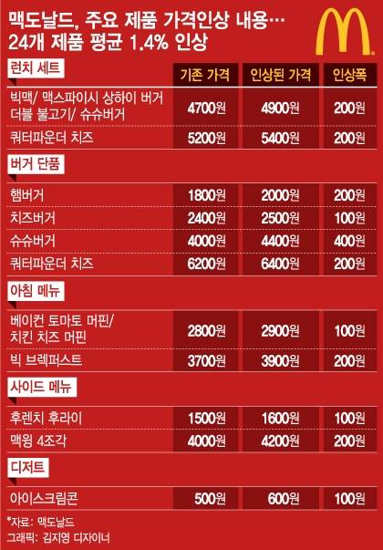 맥도날드 관계자는 "각종 제반 비용이 뛰어 불가피하게 일부 제품 가격을 올리게 됐다"며 "여타 물가 상승과 대비해 최소한의 인상폭을 유지해 고객 부담을 최소화하려고 노력했다"고 말했다.