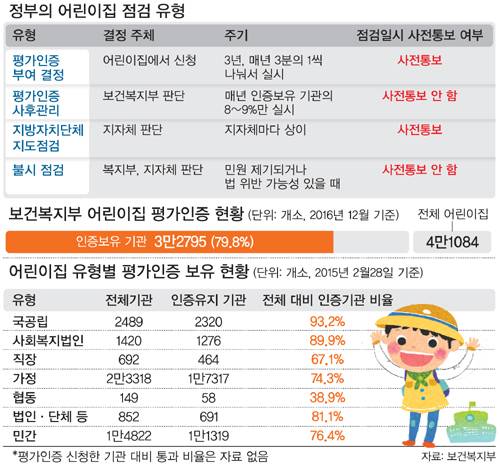복지부는 3년마다 어린이집의 평가인증 관련 점검을 하고, 인증 받은 곳의 8∼9%를 따로 선정해 매년 한 차례 사후 관리점검을 한다. 그나마 사후 관리점검은 사전 통보 없이 시행하지만 매년 전체의 8∼9%에 그쳐 어린이집당 10년에 한 번꼴이다. 지자체에서도 점검 일주일 전에 날짜를 통보해 주고 있다. 이 때문에 평가인증을 신청한 거의 모든 어린이집이 정부 기준을 충족하고 있는 실정이다.