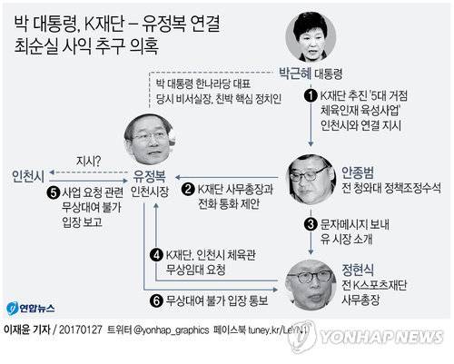 27일 사정 당국 등에 따르면 안종범 전 청와대 정책조정수석은 지난해 4월 K재단이 추진하는 5대 거점 체육인재 육성사업 추진과 관련해 "정현식 전 K재단 사무총장을 유정복 인천시장에게 연결해준 것은 박 대통령의 지시사항이 있었기 때문"이라고 검찰 조사에서 진술했다.