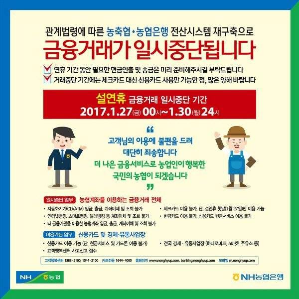 농협이 설날 내내 (27~30일) 인터넷뱅킹, ATM을 포함한 모든 금융업무를 중단한다.