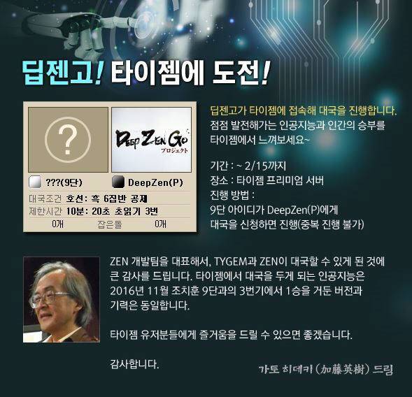 딥젠고 개발자 가토 히데키는 “딥젠고는 딥러닝 도입 후 강해졌다”면서 “2월 15일까지 타이젬 대국실에서 활동한다”고 말했다. 타이젬은 31일까지 저녁 9시부터 11시 59분까지 일반인과 딥젠고 대국 서비스를 제공한다.