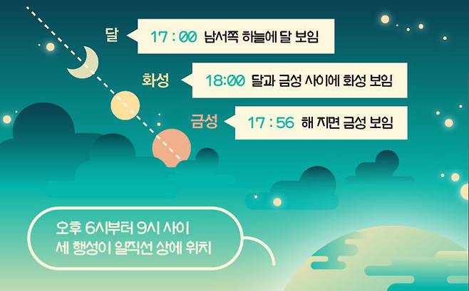 한국천문연구원은 "1일 일몰 후부터 밤 9시까지 달-화성-금성이 일렬로 늘어서는 천문 현상이 일어난다"고 밝혔습니다.
