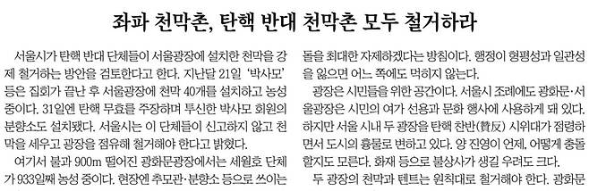 이어 <조선일보>는 "모든 일에 지나침이 없어야"하며 "광장은 시민들을 위한 공간"임에도 "서울 시내 두 광장을 탄핵 찬반 시위대가 점령하면서 도시의 흉물로 변하고 있다"며 "두 광장의 천막과 텐트는 원칙대로 철거해야 한다"고 주장했습니다. 서울광장과 광화문광장의 불법시설물일 뿐 아니라 "서울시가 세월호 유가족을 위해 지원한 천막 11개도 정리할 때가 됐다"는 주장도 은근슬쩍 끼워 넣어가면서 말입니다. 이는 사실상 '박사모 텐트도 함께 철거해야 한다'는 지점을 제외하고는 탄기국 회원들의 주장과 별반 차이가 없는 주장입니다.
