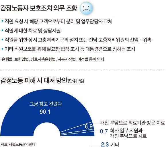 2일 고용노동부와 금융권에 따르면 지난해 6월30일부터 은행법ㆍ보험업법 등 5개 금융관련법에 감정노동자를 보호하기 위한 의무조항이 신설돼 시행되고 있다. 은행ㆍ보험사ㆍ증권사ㆍ카드사 등의 창구나 콜센터에서 고객을 대면하는 직원들이 요청할 경우 회사측은 고객으로부터 격리 조치, 직원에 대한 치료 및 상담지원 등에 나서야 하고, 상시고충처리기구를 마련해야 한다는 것이 주된 내용이다. 이를 어긴 회사에는 1,000만원 이하 과태료가 부과된다.