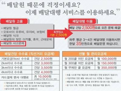 그러나 배달 앱을 이용하는 사업체는 복잡한 구조를 갖고 있다. ㅎ씨는 전용 앱을 깔고 콜을 날리는 식당들로부터 월 10만원가량 고정 수수료를 받는다. 20개 식당이 가입하면 월 200만원의 수익을 올리는 식이다. 사용된 앱 개발회사도 배달 건당 100원가량의 사용 수수료를 받아간다. 김군을 둘러싸고 ㅎ씨의 배달업체뿐 아니라 식당, 앱 개발사까지 ‘4자 구조’, 소비자까지 포함하면 ‘5자 구조’로 엮여 있는 셈이다. 앱을 사용하는 식당은 한달에 단돈 10만원만 지불하면 기존의 모든 리스크에서 벗어난다. ㅎ씨의 ‘영업 전략’도 식당들에게 이 같은 편리성을 강조(사진)하는 것이었다.