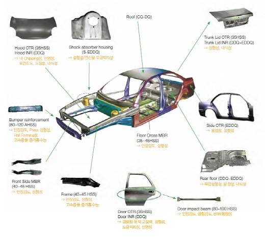 초고장력강이 기본적인 차체(BIW)를 구성하는 데 쓰였다면 일반적인 고장력강(HSS)은 면을 이루는 곳에 주로 적용된다.