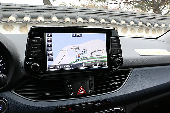 주로 사용하는 버튼은 양쪽에 배치했다. 많은 현대차들이 그렇듯 버튼 한 번만 누르면 내비게이션 화면으로 곧바로 이동하고, 그랜저처럼 페이지 이동은 좌우로 한다. 우측에 있는 맵과 내비 버튼은 손에서 약간 멀게 느껴진다. i30은 모니터 위치가 어색하긴 하지만 눈에는 잘 들어온다. 일반적인 모니터보다 높게 배치됐기 때문이다.
