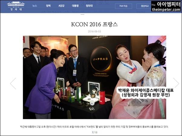 | ▲ 2016년 프랑스 방문 당시 박채윤 와이제이콥스메디칼 부스를 찾은 박근혜 대통령. 청와대 홈페이지에 관련 사진이 올라와 있다. |