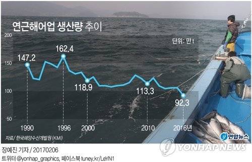 (서울=연합뉴스) 정열 정빛나 기자 = 온난화에 따른 한반도 어장 변화와 과도한 어획, 중국 어선들의 불법조업까지 겹치면서 연근해어업 생산량이 44년만에 최저치를 기록한 것으로 나타났다.