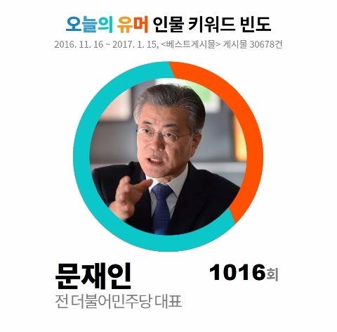 오유 에선 '문재인'이 주요 인물입니다. 3만678건 게시물 제목에 1016회 등장했죠. 오유 베스트 게시물 언급 인물 중 가장 비중이 큽니다. 전체 추출 형태소 중 가장 많이 등장한 '오늘(1272회)'의 바로 뒤를 이을 정도죠. 다음으로 많이 언급한 인물 '박근혜(430회)'보다 3배 가까이 많습니다.