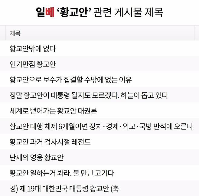 일베 이용자들은 황교안 대통령 권한대행을 '갓(god)교안'이라 부릅니다. "황교안 대행 체제 6개월이면 정치 외교 국방 반석에 오른다", "황교안 일하는거 봐라. 물 만난 고기다" 등 황 대행 체제를 지지하는 글이 많습니다. 더 나아가 "황교안 대통령(진) 각하 일 진짜 잘하신다", "황교안 대행님이 꼭 대통령 돼야 하는 이유 복습하고 가자" 며 차기 대통령으로 적극 밀고 있죠.