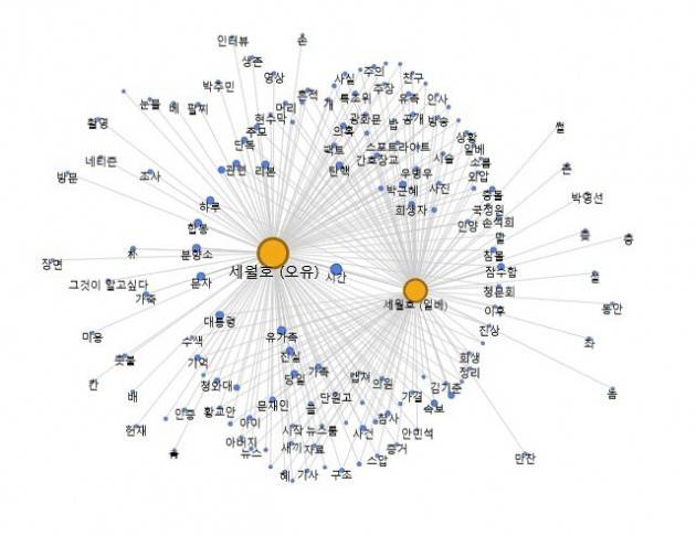 일베와 오유 모두 세월호 '7시간'에 가장 주목했습니다. '7시간'은 일베에서 33회, 오유에서 62회 '세월호'와 함께 등장해 연관 빈도가 가장 높았습니다.
