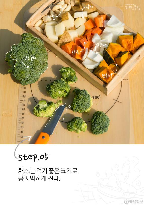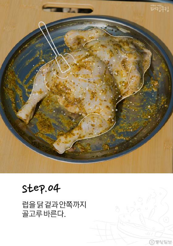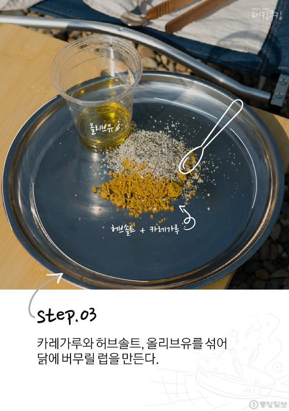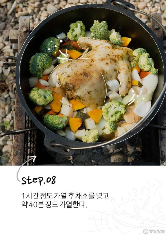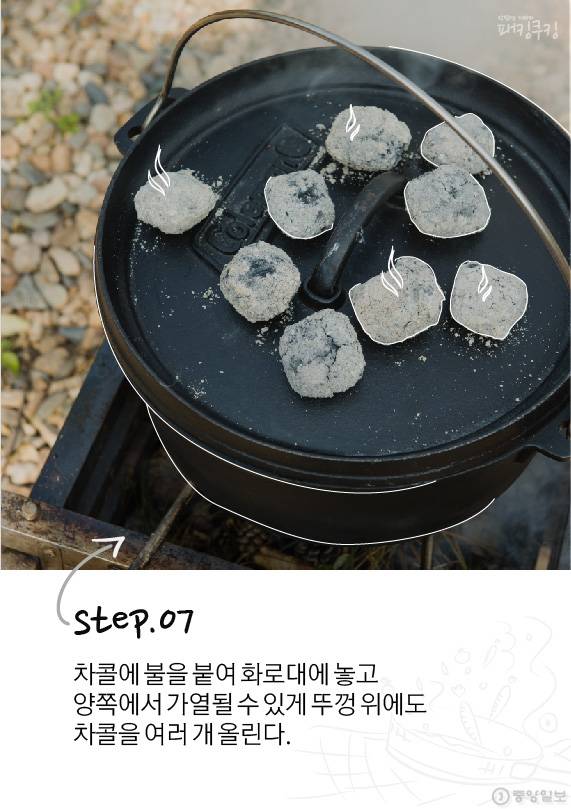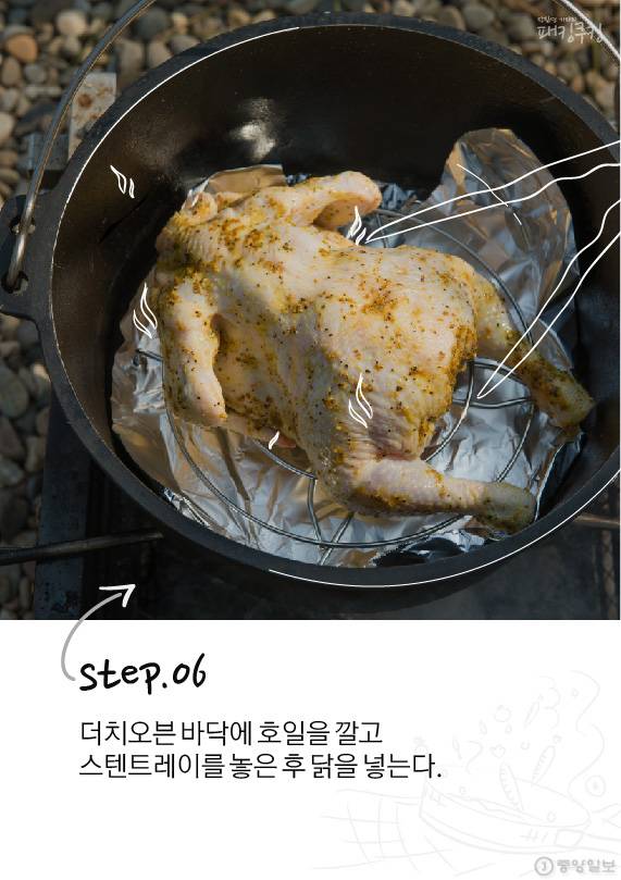 닭 표면에 바르는 양념인 럽은 시제품을 이용해도 좋지만 카레가루·허브솔트·올리브오일 조합으로 간단하게 만들 수 있습니다. 매콤함을 원하면 매운 고추가루를 넣거나 소금만 사용해 담백함을 극대화 시킬 수도 있죠. 취향에 맞게 선택하면 됩니다. 손질된 채소와 닭을 더치오븐에 넣고 챠콜 위에 올립니다.