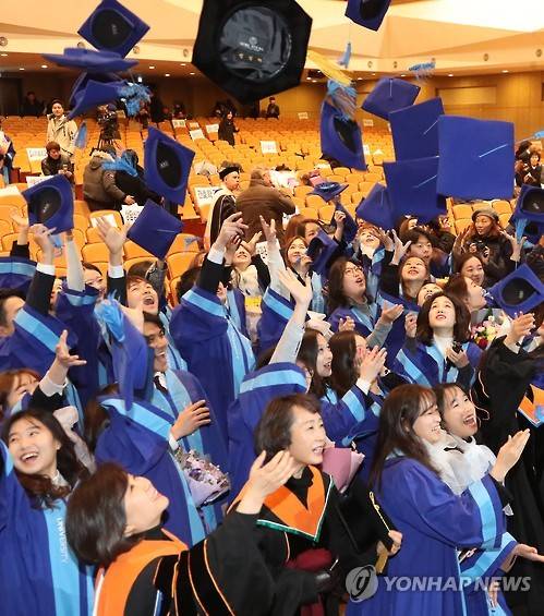 (서울=연합뉴스) 이상학 기자 = 10일 서울 노원구 삼육대에서 열린 학위수여식에서 학생들이 학사모를 던지며 졸업을 자축하고 있다. 2017.2.10